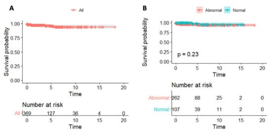- Alboukadel, K.; Marcin, K.; Przemyslaw, B.; Scheipl, F. Drawing Survival Curves Using ‘ggplot2’ [R package Survminer Version 0.4.3]; R Package Version 0.4.3; R Foundation for Statistical Computing: Vienna, Austria, 2018. [Google Scholar]