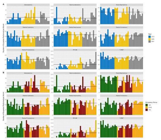 (A) Monthly urologic surgery volumes per year and subgroup analysis by surgery type. (B) Monthly surgical volumes per stringency category and subgroup analysis by surgery type. The horizontal black line indicates the overall mean number of surgeries.