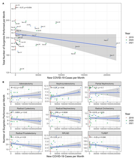 (A) Correlation between the total number of urologic surgeries per month and the number of new COVID-19 cases per month. (B) Subgroup analysis per surgery type.