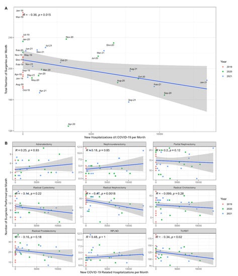(A) Correlation between the total number of urologic surgeries per month and the number of new COVID-19 related hospitalizations per month. (B) Subgroup analysis per surgery type.
