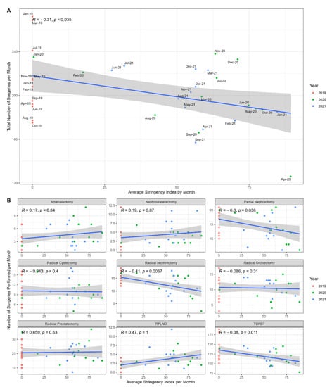 (A) Correlation between the total number of urologic surgeries per month and the monthly average Oxford Stringency Index. (B) Subgroup analysis per surgery type.