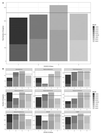 (A,B) Monthly urologic surgery volumes per COVID-19 wave and subgroup analysis by surgery type. The horizontal black line indicates the overall mean number of surgeries.