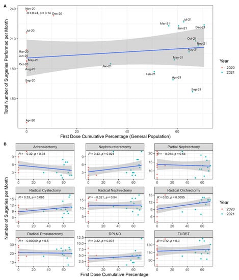 (A) Correlation between the first vaccination dose and the total number of urologic surgeries per month. (B) Subgroup analysis per surgery type.