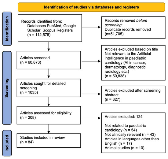 The initial search was narrowed down by limiting the search to the English language and excluding animal studies. We limited our search to studies published between January 2002 and March 2022 because of the rise in interest in AI in the field of pediatric cardiology over the last 20 years. The inclusion criteria included observational studies (case–control, case series, and cross-sectional studies), experimental studies (randomized control trials), reviews, and expert opinions on the application of AI in pediatric cardiology. Studies were excluded if they lacked direct relevance to AI or were aimed at a population other than the pediatric (18 years) age group. Studies with no full text available, conference abstracts, papers, and book chapters were also excluded.