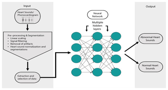 AI has the potential to improve the validity of auscultatory findings for diagnosing CHD [87,88,89]. The limitations of objective performance data have restricted wide acceptability so far [90,91,92]. The auscultatory findings of CHD are integral to the clinical diagnosis and have the benefit of being a low-cost tool, but are subject to clinical expertise, which becomes a limitation in resource-limited countries and creates a need for support to the clinician [93,94,95,96] that is objective and reportable by even peripheral health workers. The lack of trained cardiologists at the peripheral level leads to an unavoidable miss of a timely clinical diagnosis of CHD, contributing to delayed intervention and thus a poor prognosis [97]. The emergence of AI-based digital stethoscopes and cloud reporting for telemedicine has helped with the timely diagnosis and early intervention of CHD in reported samples [68,70]. The AI-based technologies also seem affordable, helping the current interest. The use of an intelligent diagnostic system based on AI algorithms such as wavelet analysis and artificial neural networks (Figure 2) has shown a specificity of 70.5% and a sensitivity of 64.7% [71,72]. The developments in AI for detecting cardiac murmurs have shown promise in terms of sensitivity but still require clinical validation before wide clinical recommendation [73,98].