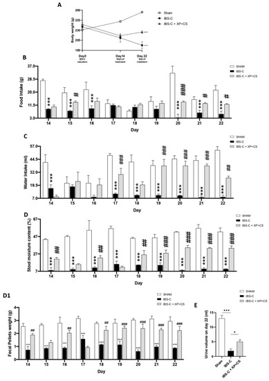 The main pathological features of IBS-C include alterations to GI motility, hard stools and painful swelling [26]. Here, the body weight of Sham rats with no constipation naturally increased from day 1 to 22. On the contrary, rats with IBS-C had significantly lower body weight compared to Sham rats, especially from day 14 to 22. However, after treatment with XP + CS for 7 days, the respective body weight was significantly increased (Figure 1 panels A). Similar trends were observed in food and water intake. The food and water intake were significantly reduced in IBS-C animals compared to Sham group. The 7-day treatment with XP + CS significantly restored food and water intake (Figure 1 panels B and C, respectively). The moisture content of the feces was used to measure the level of constipation [27]. Interestingly, IBS-C induced rats showed significantly lower stool moisture content compared to the Sham rats, whereas XP + CS treatment, given for 7 days, significantly increased the stool moisture content already within the first day of treatment and a further improvement was displayed at the end of the treatment (Figure 1 panel D). These data were also confirmed by fecal pellet weight analysis (Figure 1 Panel D1). Moreover, lower urine volume observed in IBS-C induced rats was increased by XP + CS treatment (Figure 1 panel E).