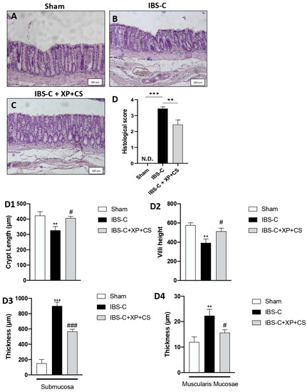 XP and CS treatment alleviate IBS constipation. Histological evaluation of colons at day 22. (A) Intact colon tissue from Sham group. (B) Colon tissue significantly damaged after IBS-C induction (IBS-C group). (C) XP + CS treatment alleviated colon damage after constipation (IBS-C + XP + CS group). (D) Histological score. (D1–D4) histomorphic parameters. *** p < 0.001 vs. Sham; ** p < 0.01 vs. Sham; ### p < 0.001 vs. IBS-C; # p < 0.005 vs. IBS-C; ND: not detectable.
