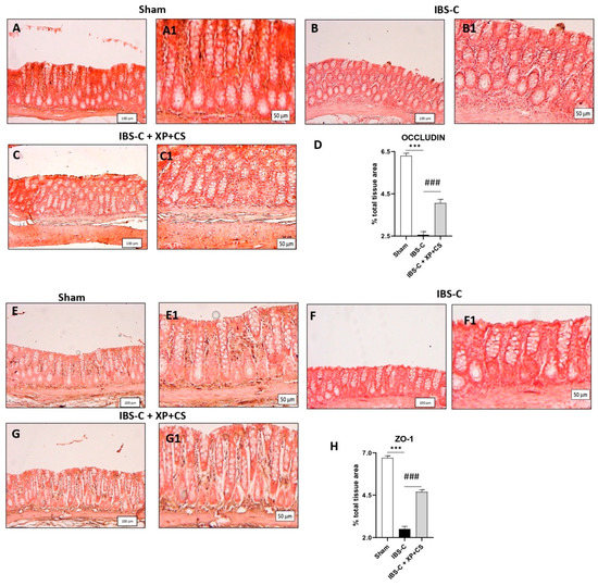 XP and CS treatment restored tight junctions’ expression after IBS constipation. (A and A1) Basal expression of Occludin in the colon of Sham rats (magnification 10x and 20x). (B and B1) Loss of tight junction Occludin immunopositivity in the colon from IBS-C rats (magnification 10x and 20x). (C and C1) XP + CS treatments restored Occludin immunopositivity after IBS-C (magnification 10x and 20x). (D) Percentage of Occludin signal/total area. *** p < 0.001 vs. Sham; *** p < 0.001 vs. IBS-C. (E and E1) Basal expression of ZO-1 in the colon of Sham rats (magnification 10x and 20x). (F and F1) Loss of tight junction ZO-1 immunopositivity in the colon from IBS-C rats (magnification 10x and 20x). (G and G1) XP + CS treatments restored ZO-1 immunopositivity after IBS-C (magnification 10x and 20x). (H) Percentage of ZO-1 signal/total area. *** p < 0.001 vs. Sham; ### p < 0.001 vs. IBS-C.