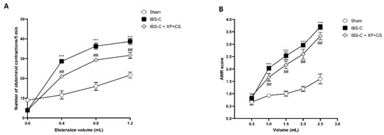 XP and CS considerably decreases abdominal pain following IBS-C. (A) Number of abdominal contractions measured in 5 min in Sham, IBS-C and IBS-C + XP + CS groups; (B) AWR to colon rectal distension (0.5, 1, 2, 3 mL balloon inflation) in Sham, IBS-C and IBS-C + XP + CS groups. *** p < 0.001 vs. Sham; ## p < 0.01 vs. IBS-C.