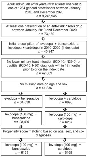 Clinically, PD is diagnosed as part of a three-step process based on criteria defined by the International Parkinson and Movement Disorder Society, whereby the occurrence of bradykinesia and at least one additional cardinal motor feature (rigidity or rest tremor) is absolutely necessary to make the diagnosis [8,9]. Typically, the diagnosis of PD arises with the onset of these motor symptoms but their onset may have been preceded by a “prodromal phase” with typical non-motor symptoms (e.g., REM sleep behavior disorder, depression, hyposmia, anxiety) for several years [10]. Autonomic dysfunctions (e.g., orthostatic hypotension, fatigue, urinary dysfunction, etc.) affecting up to 70% of PD patients become even more prevalent during the course of PD and significantly reduce patients’ quality of life [11]. With regard to urinary dysfunction, it is hypothesized that in patients with PD, the depletion of dopaminergic neurons in the substantia nigra in parallel with the loss of ventral tegmental area mesolimbic dopaminergic fibers impairs neurogenic bladder control, leading to severe bladder dysfunctions [12,13]. It is important to note that the occurrence of lower urinary tract infections (LUTI) is one of the leading causes of acute hospitalization in patients with PD [14,15]. In practice, multiple factors such as altered urodynamics (detrusor overactivity and resulting urge incontinence, increased residual urine volume), and, especially in patients with PD-related dementia, frailty and diminished cognitive reserve increase the risk of LUTI [14,16,17]. Importantly, a recently published systematic review and meta-analysis reported a pooled prevalence of lower urinary tract symptoms (LUTS) in PD of 61% and a pooled prevalence of storage symptoms and voiding symptoms of 59% and 24%, respectively [18]. In light of this connection, several studies have analyzed the impact of dopaminergic drugs on urinary dysfunctions with conflicting results [19]. However, there is no evidence in the literature of any connection with the occurrence of LUTI when comparing the most commonly used antiparkinsonian medications. Aiming to explore the topic more thoroughly, we conducted a retrospective cohort study and included patients with an initial prescription of levodopa-based therapy including fixed-dose combinations of levodopa + benserazide and levodopa + carbidopa to analyze the incidence of LUTI and antibiotic drug prescriptions.