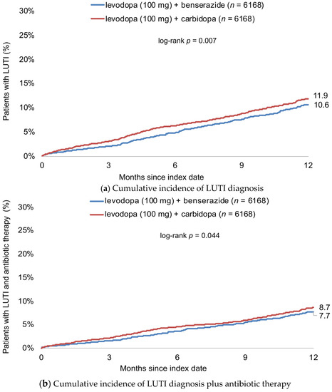 Cumulative incidence of LUTI diagnosis (a) and antibiotic therapy (b) within 12 months after start of therapy in patients treated with levodopa (100 mg) + benserazide and levodopa (100 mg) + carbidopa.