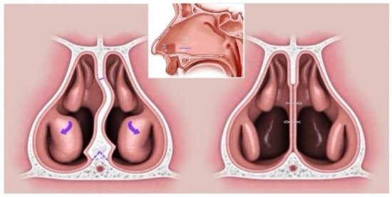 Mini-invasive septoturbinoplasty (MIST) involves excision of deviated septum, triangular hump preservation of nasal floor, incision drainage along nasal floor and trans-septal sutures and out-fracture of inferior turbinate. Arrow: out-fracture of inferior turbinate.