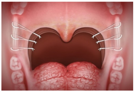- Li, H.Y.; Lee, L.A.; Kezirian, E.J.; Nakayama, M. Suspension palatoplasty for obstructive sleep apnea- A preliminary study. Sci. Rep. 2018, 8, 4224. [Google Scholar] [CrossRef]