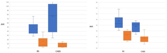 Perioperative changes in AHI and BMI in both BS group and CABS group. Preoperative (blue), postoperative (brown). CABS—combined airway and bariatric surgery, BS—bariatric surgery, BMI—body mass index, AHI—apnea–hypopnea index.
