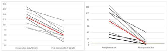 Perioperative changes in body weight and apnea–hypopnea index (AHI) in individual patients (CABS group). Red line: line of median change.