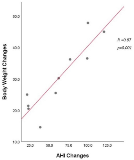 Changes in apnea–hypopnea index (AHI) are significantly correlated with changes in body weight (r = 0.87, p = 0.001) after combined airway and bariatric surgery.
