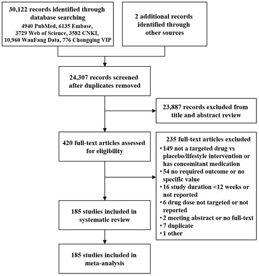 The initial search identified 30,124 records, of which 420 records were assessed in full texts. Finally, 185 trials were included [,,,,,,,,,,,,,,,,,,,,,,,,,,,,,,,,,,,,,,,,,,,,,,,,,,,,,,,,,,,,,,,,,,,,,,,,,,,,,,,,,,,,,,,,,,,,,,,,,,,,,,,,,,,,,,,,,,,,,,,,,,,,,,,,,,,,,,,,,,,,,,,,,,,,,,,,,,,,,,,,,,,,,,,,,,,,,,,,,,,,,,,,], which identified 38,376 patients randomly assigned to 23 drugs from eight classes or PBO/LI (Figure 1). The sample size of the trials varied from 16 to 888. The study duration ranged from 12 weeks to 108 weeks. Metformin was studied in 40 trials, with pioglitazone (23 trials), acarbose (22 trials), and rosiglitazone (21 trials) being the three next most studied drugs. No eligible trial was detected for gliquidone, mitiglinide, beinaglutide, or insulin. The participants were from 56 countries across six continents. Mean age varied from 30.8 years to 74.5 years, with a diabetes duration of 0.23 year to 9.9 years. The characteristics with the risk of bias of the trials are presented in Supplementary Table S3. The publication bias is shown in Supplementary Figure S1.