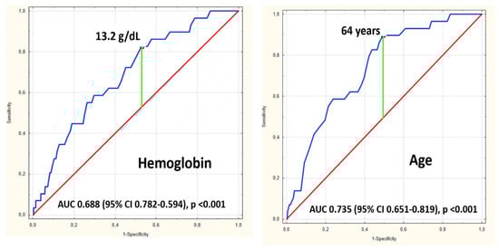 We performed receiver operating characteristics analysis for hemoglobin concertation and for age in the prediction of all-cause mortality after the discharge. For hemoglobin AUC was 0.688 (95% CI 0.782–0.594), p-value < 0.001; Youden index based on ROC curve analysis was 13.2 g/dL. AUC for age was 0.735 (95% CI 0.651–0.819), p-value < 0.001 and age of 64 years was identified with Youden Index (Figure 1).