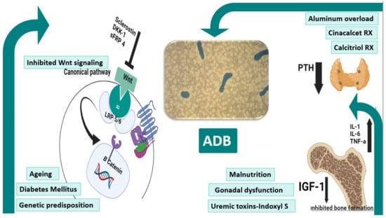 The pathophysiology of ADB is certainly multifactorial (Figure 1), comprising patient-related and iatrogenic factors on a predisposed genetic background. A state of imbalance between the low circulating levels of bone anabolic factors (e.g., insulin-like growth factor (IGF)-I) and the increased expression of bone-turnover–inhibitory factors, such as sclerostin and Dickkopf-related protein-1 (Dkk-1), largely predominates. This imbalance ultimately suppresses bone formation through repression of WNT/β-catenin signaling []. Moreover, uremic toxins may play a role in this setting. Uremic toxins are compounds that accumulate in the body as renal function declines, adversely affecting the function of multiple organs and systems. Indoxyl sulfate, a protein-bound uremic toxin (PBUT) generated by the gut microbiome from the metabolism of tryptophan, has been linked to LBT []. Experimental evidence suggests that the gut-derived toxin indoxyl sulfate aggravates LBT and inhibits osteoclast function and differentiation; however, further clinical studies would be more conclusive [,,]. Of note, the circulating cytokines, for instance interleukin-1 (IL-1), IL-6, and tumor necrosis factor α (TNFα), have been supposed to directly impair bone-forming and -resorbing cells [,,].
