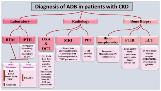 Diagnosis of ADB in patients with CKD. Diagnosis mainly relies on bone biopsy, gold standard, and reduced bone-formation and bone-resorption markers. ADB: adynamic bone, BSAP: bone-specific alkaline phosphatase, BMD: bone-mineral density, BTM: bone-turnover markers, CKD: chronic kidney disease, DKK-1: Dickkopf-related protein-1, DXA: Dual-energy X-ray absorptiometry, FTIR: Fourier-transform infrared spectroscopy, iPTH: intact parathyroid hormone, MRI: magnetic-resonance imaging, P1NP: procollagen type 1 N-terminal pro-peptide, PET: positron emission tomography, QCT: quantitative computed tomography, TAP: total alkaline phosphatase, TMV: turnover/mineralization/volume, TRAP 5B: tartrate-resistant acid phosphatase 5b, μCT: micro-computed tomography.