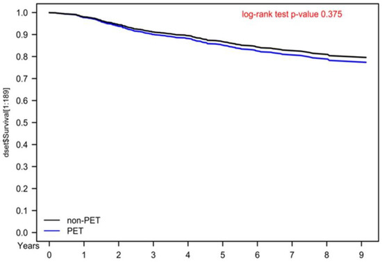 From the National Health Insurance Research Database (NHIRD), we identified patients who underwent 18F-FDG-PET–CT within 0 to 60 days before the index date. Patients with a record of 18F-FDG-PET–CT were considered to have undergone preoperative PET–CT, whereas those without records were considered to have not undergone preoperative PET–CT. For the non-PET group, clinical stages were determined on the basis of the findings of chest, abdominal, and pelvic CT and pelvic magnetic resonance imaging (MRI) with contrast. For the PET group, clinical stages were determined on the basis of the findings of chest, abdominal, and pelvic CT; pelvic MRI with contrast; and PET–CT. Nuclear- medicine physicians and radiologists officially reviewed and provided reports on all the images. All PET–CT reports were interpreted by nuclear-medicine physicians. The Taiwan Cancer Registry Database (TCRD) is unique because all PET–CT reports are reviewed and reported by well-trained nuclear-medicine physicians. Moreover, the Taiwan Cancer Registry Administration randomly reviews the reports of images through peer review to verify the accuracy of diagnoses, and hospitals with outlier chargers or practices may be audited and subsequently be heavily penalized if malpractice or discrepancies are identified. The primary outcome of interest was all-cause death, which was determined from the index date to the date of death. Information on overall survival (OS) was obtained from the Cause of Death database. Patients whose death records could not be found were considered alive, and their data were censored on the last day of the database record (31 December 2019).