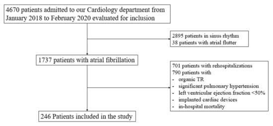 We included all AF patients admitted consecutively to the Cardiology Department, according to the criteria previously published []. Patients with organic TR, significant pulmonary hypertension, left ventricular ejection fraction < 50%, those with implanted cardiac devices [,] and those with in-hospital mortality were excluded. Rehospitalizations of the same patient were also excluded.