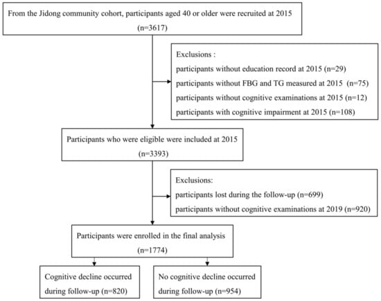 The Jidong Cognitive Impairment Cohort Study (CICS) is a community-based, long-term observational cohort study designed to investigate the potential prognostic factors and the risk of cognitive impairment []. The inclusion criteria for participants in this study include the following: (i) age of 40 years or older; (ii) no related diseases that may affect the cognitive function assessments, for instance, severe aphasia, hearing loss, visual impairment, psychosis or schizophrenia (documented in the questionnaire); and (iii) provision of signed informed consent. A total of 3617 participants aged 40 years or older were recruited into the CICS in 2015. Among these participants, the following were further excluded: 75 individuals without fasting blood glucose and triglyceride data in 2015, 29 individuals without an education record, 108 individuals with cognitive impairment in 2015, 932 individuals without cognitive examinations in 2015 and 2019, and 699 participants who were lost during follow-up. Eventually, a total of 1774 participants were ultimately enrolled in this study and were followed for 4 years until 2019.