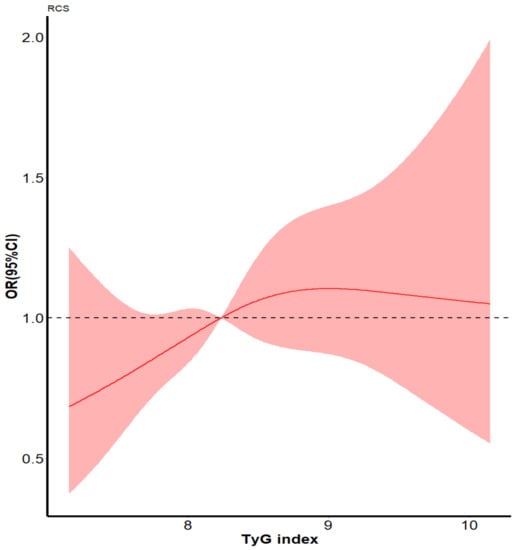 Spline models of the association between the TyG index and the risk of cognitive decline. The odds ratios from the multivariate Cox proportional hazard regression model were adjusted for the variables in model 2 in Table 3. The red line indicates the adjusted odds ratio, and the red area indicates the 95% confidence interval. Abbreviations: TyG, triglyceride-glucose.