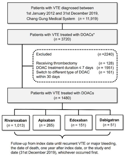 Enrollment and follow-up of study patients. A total of 11,919 patients with newly diagnosed VTE from January 2012 to December 2019 were identified. After relevant exclusion, 1480 patients treated with DOACs were included in the study; of whom, 1013 (68.4%), 265 (18%), 151 (10.2%), and 51 (3.4%) received rivaroxaban, apixaban, edoxaban, and dabigatran, respectively. Those initiated on an anticoagulant therapy for more than 3 months after VTE diagnosis were not included. DOAC, direct oral anticoagulant; VTE, venous thromboembolism. * Those who started anticoagulation therapy more than three months after VTE diagnosis will not be included.