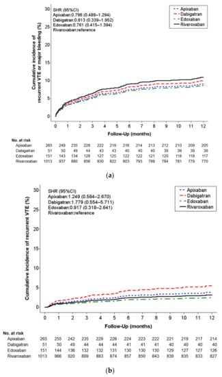 The recurrent VTE rate of the DOACs at 12 months ranged from 2.6% to 5.8%, which was higher than the rates in randomized studies discussing the treatment effect of DOACs. The EINSTEIN DVT and EINSTEIN PE trials included patients with DVT or PE to evaluate and compare the efficacy and safety of rivaroxaban with warfarin [,,]. The recurrent VTE rate of rivaroxaban was 2.1% in the EINSTEIN DVT and PE trials but was 3.5% in our analysis. The recurrent VTE rate of apixaban was 4.2% in our analysis, which was higher than the 2.3% reported in the AMPLIFY study []. The recurrent VTE rate of dabigatran was 5.9% in our analysis, which was higher than the 2.3% reported in the pivotal clinical trials []. The discrepancy between the recurrent VTE rates in our study and randomized trials may be multifactorial, with the differences in the background characteristics of the study population being a potential explanation. More patients with cancer were noted in our cohort (41.1%) compared with the EINSTEIN program (5.6%), the AMPLIFY study (2.6%), and a trial on dabigatran (3.9%). Studies demonstrated higher rates of recurrent VTE in patients with cancer under warfarin therapy than in patients without cancer [,]. A meta-analysis of RCTs, including Re-Cover I and II, EINSTEIN DVT, EINSTEIN PE, and Hokusai-VTE, demonstrated a higher recurrent VTE rate (4.1%) in patients with cancer and receiving DOAC therapy than in patients without cancer (2.6%) []. In fact, the previous study demonstrated that Asian patients were more likely to have active cancer (19.8% vs. 8.1%) or a history of cancer (19.1% vs. 12.0%) than patients from the rest of the world []. In our previous study comparing DOACs with low-molecular-weight heparin in Asian patients with cancer-associated VTE, the recurrent VTE rate at 1 year in the DOAC group was 7.2% []. Therefore, when evaluating the recurrent VTE rate in patients with VTE in real-world practice, the underlying comorbidity of active cancer must be considered because the recurrent VTE rate could be higher in patients with cancer than in those without cancer.