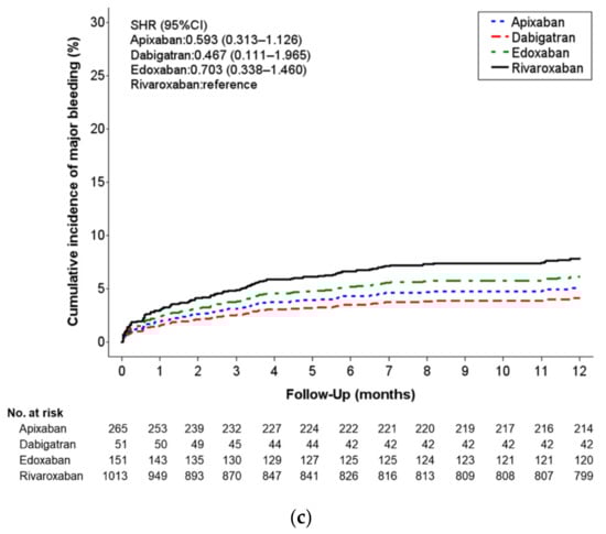 (a) Cumulative incidence of recurrent VTE or major bleeding at 1-year follow-up for each DOAC type. (b) Cumulative probability of event rates in each study group for recurrent VTE. (c) Cumulative probability of event rates in each study group for major bleeding.