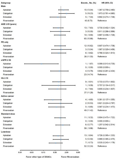 To the best of our understanding, this is the first population-based study that evaluated the clinical effectiveness and safety outcomes of four DOACs in Asian patients with VTE. The results revealed that different DOAC treatments were not associated with varying rates of recurrent VTE or major bleeding in the Asian population. Furthermore, in the subgroup analysis, no significant differences in the composite outcomes were observed between the rivaroxaban and other DOAC groups. VTE management is based on balancing the treatment benefits and risk of bleeding; therefore, treatment consideration for Asian patients with VTE is crucial because of the inherited risk of intracranial hemorrhage with vitamin K antagonists. Major phase III clinical trials have suggested that DOACs have advantages over warfarin regarding bleeding outcomes; however, only a few Asian patients were included in these studies [,,,,]. Furthermore, data on the direct comparison of effectiveness and safety among different DOACs are limited. Therefore, to overcome this limitation, we specifically focused on the Asian population and provided crucial information on the effectiveness and safety profile of four DOACs.