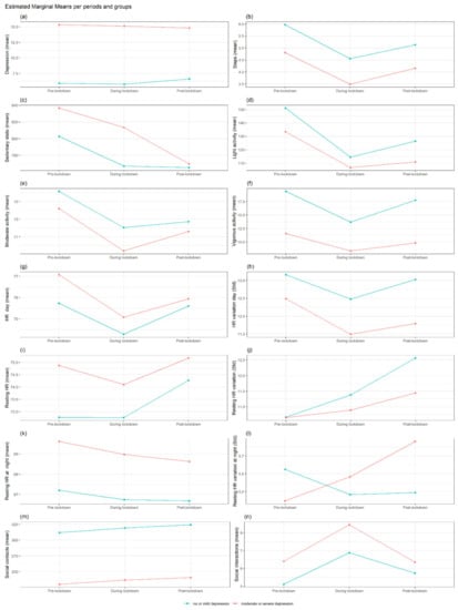 Interaction trajectories by depression status in MS group. Estimated marginal means per MS groups based on depression status (moderate or severe depression versus no or mild depression at baseline) across the three periods (pre, lockdown and post-lockdown) for depression severity (a), activity features (b–f), HR features (g–l), sociality (m,n). Note: PHQ-8 = depression severity, Steps = mean steps per day, Sedentary = Number of minutes per day classified as sedentary. Light, moderate and vigorous activity = the number of minutes per day classified as “light”, “moderate” or “vigorous activity”, mHR day = mean heart rate (HR) during 24 h, std HR = standard deviation of HR during 24 h, restingHR day = HR at rest during 24 h, Resting HR at night = HR at rest during the night (0:00–05:59), social contacts = number of contacts in the agenda, social interactions = interactions trough social apps.
