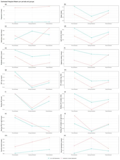 Linear mixed-effects regression analyses for repeated measures (including depressive symptoms, HR, physical activity and social activity as independent variables) were fitted to assess the changes in the mean total score of each daily parameter among the three periods: pre-, during and post-lockdown (defined for each country). We then added the baseline depression severity into each model (Depression severe or moderate = 1, No depression or mild = 0, using a PHQ-8 cut-off ≥10). The baseline depression severity was calculated from the last PHQ-8 measurement before the pre-lockdown period, so it is generally in the range of the previous two weeks prior to that period. In this model, we also included an interaction term between period and baseline depression severity to investigate whether the change in the outcome variables over time varied according to depression severity (Figure 1 and Figure 2). Finally, in the previous model, we incorporated gender as a second exposure variable, including an interaction term between period, depression severity and gender, to investigate whether the rate of change in the outcome variables over time varied according to depression severity and gender.