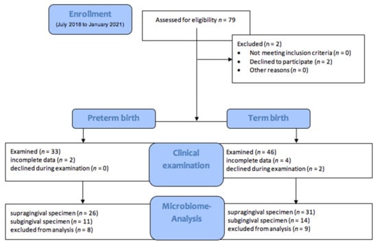 A total of 79 women were enrolled in this study: 33 had a PTB (≤37 weeks of pregnancy), and 46 had a TB (>37 weeks). Two patients with term birth declined during the examination (Figure 1).