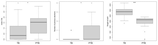 Impact of the clinical parameters and alpha diversity index on the risk factor, generalized linear model: mean CAL; number of previous abortions; weight of child. Note: TB = Term birth; PTB = Preterm birth; CAL = clinical attachment loss; * p < 0.05; *** p < 0.001; ° = outliers.