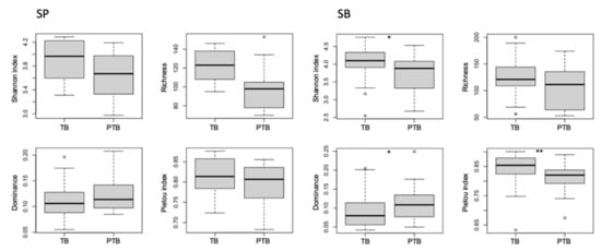 Impact of the groups on alpha-diversity, richness, evenness and dominance of supragingival (SP) and subgingival (SB) plaque. Note: SP = supragingival; SB = subgingival; TB = Term birth; PTB = Preterm birth; * p < 0.05; ** p < 0.01; ° = outliers.