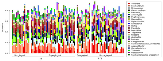 Barplot, abundance of supra- and subgingival samples for the preterm birth group (PTB) and term birth group (TB). Note: TB = Term birth; PTB = Preterm birth.