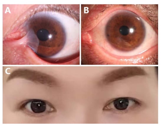 Case 2. The 36-year-old lady has recurrent pterygium, symblepharon, and limited abduction after four prior surgeries (A); No recurrence was observed after 36 months follow up with a silent ocular surface (B); Bilateral orthotropic and cosmetic appearance were restored (C).