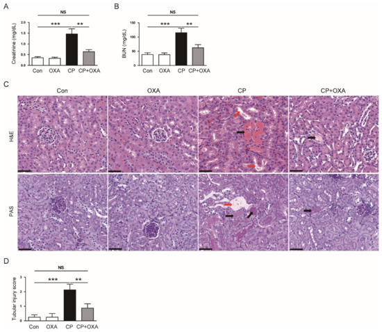 Mice injected with cisplatin had elevated serum creatinine and BUN concentrations (Creatinine: Con, 0.36 ± 0.05 mg/dL vs. CP, 1.46 ± 0.24 mg/dL, p < 0.001; BUN: Con, 38.3 ± 6.1 mg/dL vs. CP, 115.0 ± 16.1 mg/dL, p < 0.001) (Figure 1A,B). However, OXA significantly reduced the elevated levels of both markers of kidney function (Creatinine: CP, 1.46 ± 0.24 mg/dL vs. CP + OXA, 0.64 ± 0.09 mg/dL, p < 0.01; BUN: CP, 115.0 ± 16.1 mg/dL vs. CP + OXA, 62.0 ± 11.4 mg/dL, p < 0.01) (Figure 1A,B). Next, the effect of OXA on the histopathological changes induced by cisplatin was analyzed. Histological examination revealed that mice injected with cisplatin exhibited histological abnormalities such as tubular dilation and cast formation (Figure 1C,D). These changes were significantly alleviated by OXA (Tubular injury score: CP, 2.1 ± 0.4 vs. CP + OXA, 0.9 ± 0.3, p < 0.05) (Figure 1C,D).