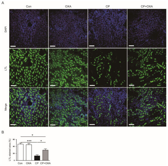 Next, we performed IF staining for LTL to visualize the brush borders of the proximal tubules [22,23]. Mice injected with cisplatin had largely reduced areas of LTL staining (Con, 46.6 ± 3.2% vs. CP, 13.3 ± 3.1%, p < 0.001) (Figure 2A,B). However, OXA significantly attenuated the brush border loss (CP, 13.3 ± 3.1% vs. CP + OXA, 29.5 ± 3.9%, p < 0.05) (Figure 2A,B).