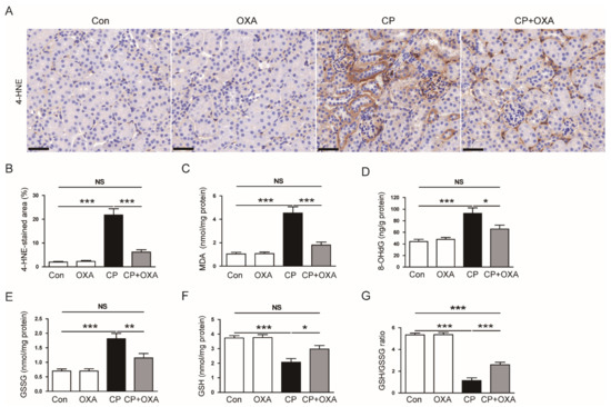 Effect of OXA on oxidative stress in mice injected with cisplatin. (A) IHC staining of kidney sections for 4-hydroxynonenal (4-HNE). Scale bar = 40 μm. (B) Percentages of 4-HNE-positive area. (C) Renal malondialdehyde (MDA) levels. (D) Renal 8-hydroxy-2’-deoxyguanosine (8-OHdG) levels. (E) Renal oxidized glutathione (GSSG) levels. (F) Renal reduced glutathione (GSH) levels. (G) GSH/GSSG ratio. * p < 0.05, ** p < 0.01 and *** p < 0.001. NS, not significant.