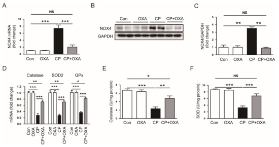Effect of OXA on prooxidant and antioxidant enzymes in mice injected with cisplatin. (A) Renal nicotinamide adenine dinucleotide phosphate oxidase 4 (NOX4) mRNA levels. (B) Western blotting of NOX4. (C) Quantification of protein expression of NOX4. (D) Renal catalase and superoxide dismutase 2 (SOD2) mRNA levels. (E) Catalase activity. (F) SOD activity. * p < 0.05, ** p < 0.01 and *** p < 0.001. NS, not significant.
