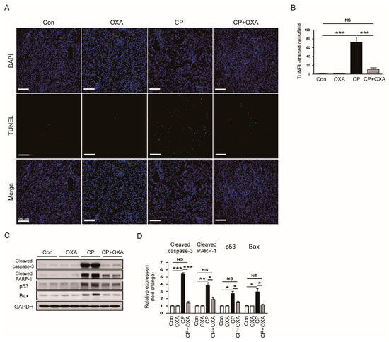 Effect of OXA on apoptotic cell death in mice injected with cisplatin. (A) TdT-mediated dUTP nick end labeling (TUNEL) staining on kidney sections. Scale bar = 50 μm. (B) Number of TUNEL-positive cells. (C) Western blotting of cleaved caspase-3, cleaved poly(ADP-ribose) polymerase-1 (cleaved PARP-1), p53, and Bax. (D) Quantification of protein expression of cleaved caspase-3, cleaved PARP-1, p53, and Bax. * p < 0.05, ** p < 0.01 and *** p < 0.001. NS, not significant.