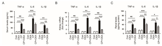 Effect of OXA on serum and renal levels of cytokines in mice injected with cisplatin. (A) Serum tumor necrosis factor-α (TNF-α), interleukin-6 (IL-6) and IL-1β levels. (B) Renal TNF-α, IL-6 and IL-1β mRNA levels. (C) Renal TNF-α, IL-6 and IL-1β protein levels. * p < 0.05, ** p < 0.01 and *** p < 0.001. NS, not significant.