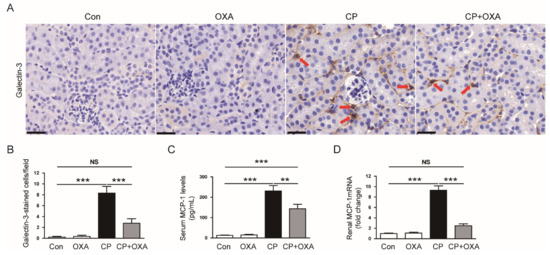 Effect of OXA on macrophage accumulation and monocyte chemoattractant protein-1 (MCP-1) expression in mice injected with cisplatin. (A) IHC staining of kidney sections for galectin-3. Red arrows indicate galectin-3-positive cells. Scale bar = 60 μm. (B) Number of galaectin-3-positive cells. (C) Serum MCP-1 levels. (D) Renal MCP-1 mRNA levels. ** p < 0.01 and *** p < 0.001. NS, not significant.