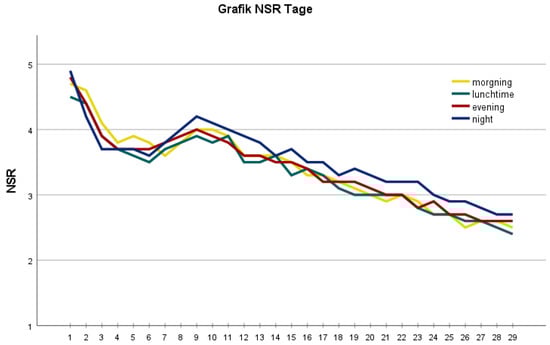 Graph represents the morning, lunchtime, evening, and nighttime pain on days 1–29 on an NRS scale.