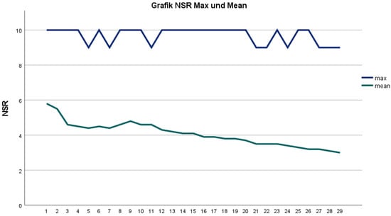 Overall, postoperative pain decreases significantly after TKA. In the first postoperative week, the lowest pain scores were on day 8 with an NRS of 4.6. This increased to 4.8 on day 9. The reason for the increase in pain progression may be related to the start of the intensive rehabilitation program. Subsequently, there was a constant decrease in the pain level from day 10 to day 29. Another study showed a comparable mean maximum pain of 5.44 ± 1.83 on the first postoperative day [7]. Here, the NSR was 5.8 ± 2.8. An increase from the middle of the first postoperative week to the end of the week had already been observed in another study [8].