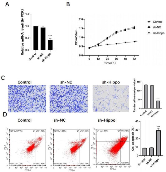 Knockdown of Hippo inhibits the activity of ovarian cancer cells in vitro. After Hippo transfection: (A) sh-Hippo transfection efficiency was detected by RT-PCR; (B) detection of ovarian cancer cell proliferation activity by MTT; (C) detection of ovarian cancer cell invasion activity by Transwell, original image × 50; (D) detection of ovarian cancer cell apoptosis level by flow cytometry. Compared with control group, ** p < 0.01, *** p < 0.001.