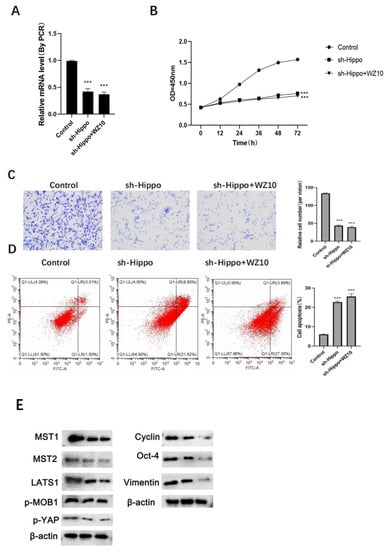 LATS1 can phosphorylate YAP, a significant Hippo pathway downstream effector, thereby inhibiting YAP nuclear translocation [18,19]. Together with TEAD, YAP functions in the nucleus as a transcriptional coactivator to suppress RB/p16 expression and promote the expression of cyclin, Oct-4 and vimentin, which are connected to cell proliferation, cell cycle arrest and cellular senescence [20,21,22]. After ovarian cancer cells were treated with WZ10, there was a dose-dependent, significant downregulation in the expressions of cyclin, Oct-4 and vimentin, suggesting that WZ10 treatment could inhibit the activation of the Hippo-YAP pathway. In a similar manner, Western blot analysis confirmed that using sh-RNA to knock down Hippo can significantly prevent the activation of Hippo-YAP signaling, thereby inhibiting the in vitro activity of ovarian cancer. This inhibition is manifested as a decrease in the proliferation and invasion ability of ovarian cancer cells, as well as a significant increase in the level of apoptosis.